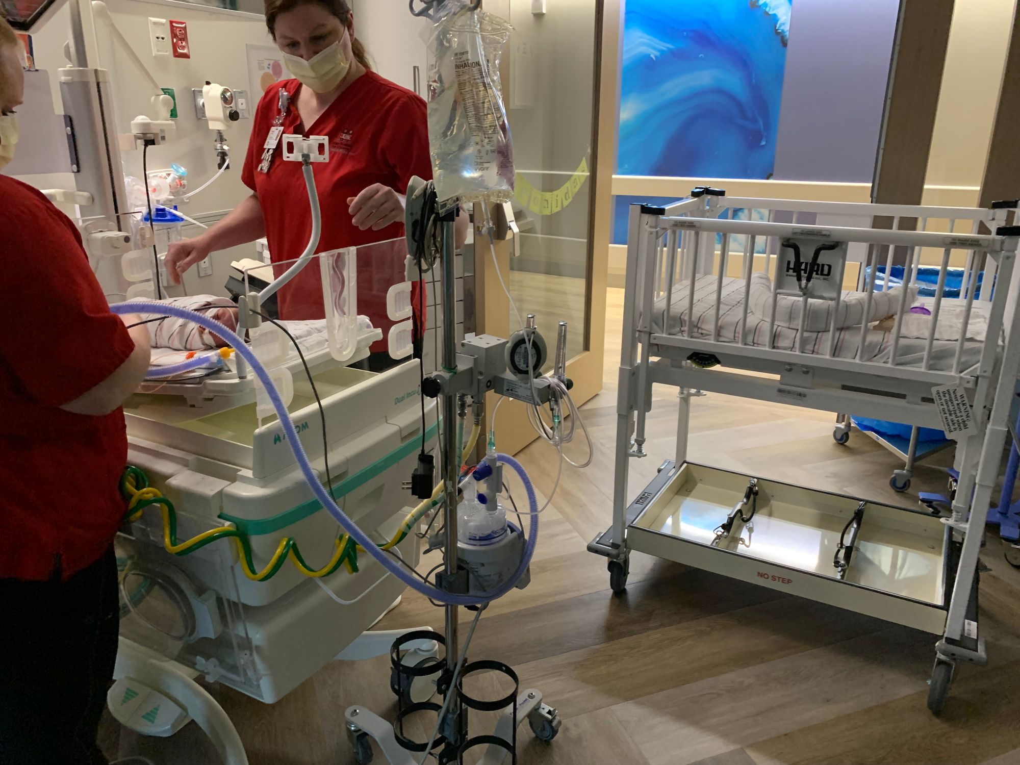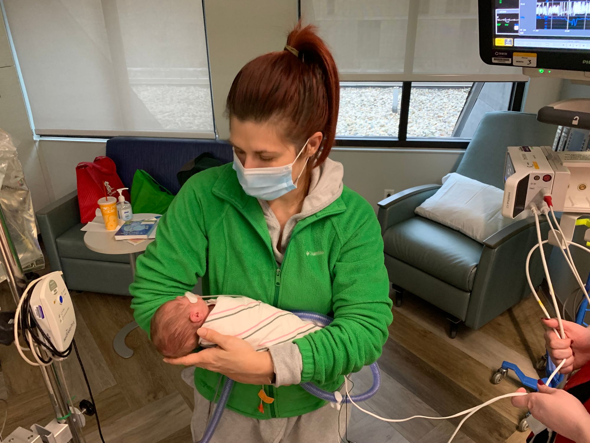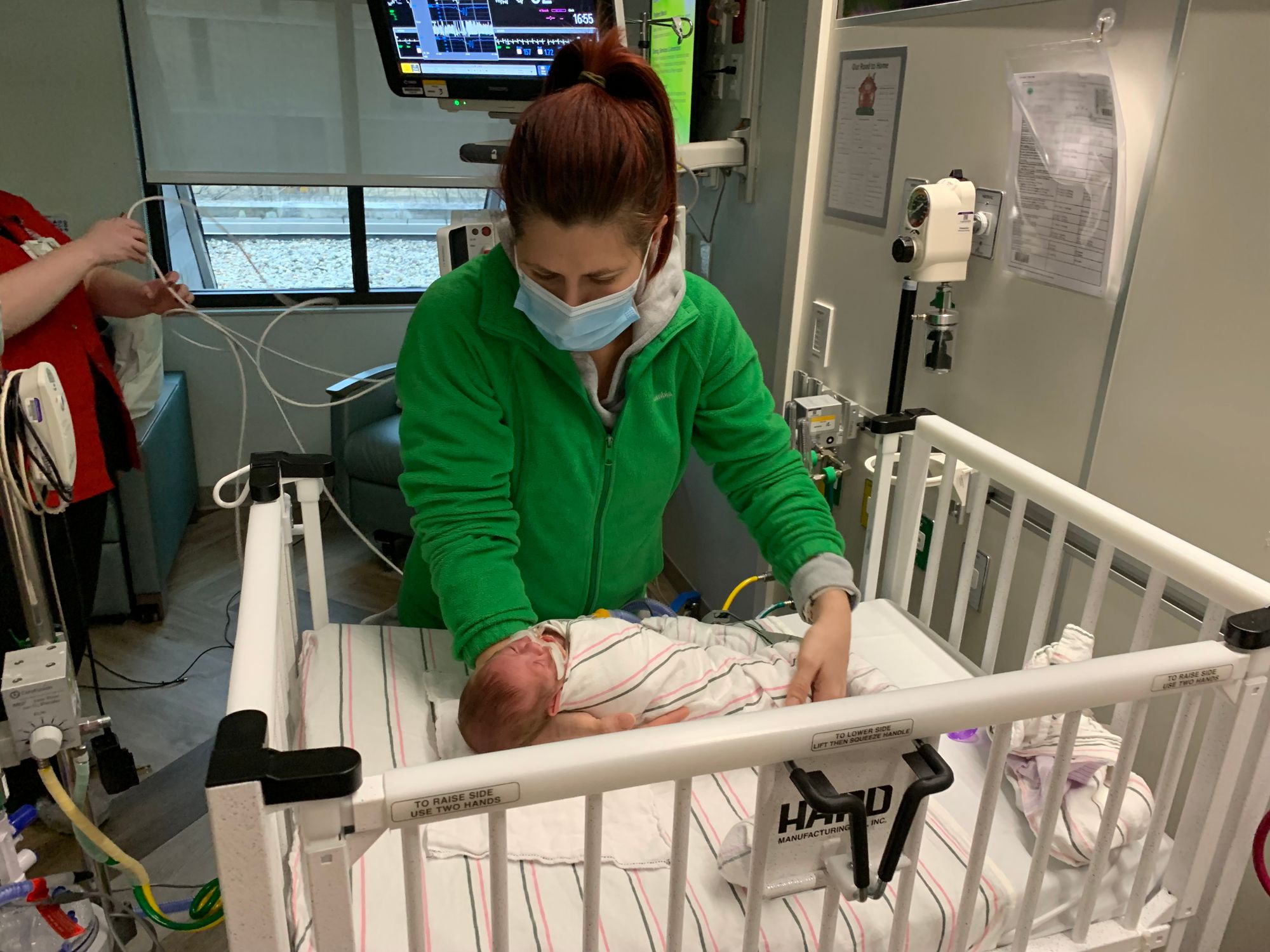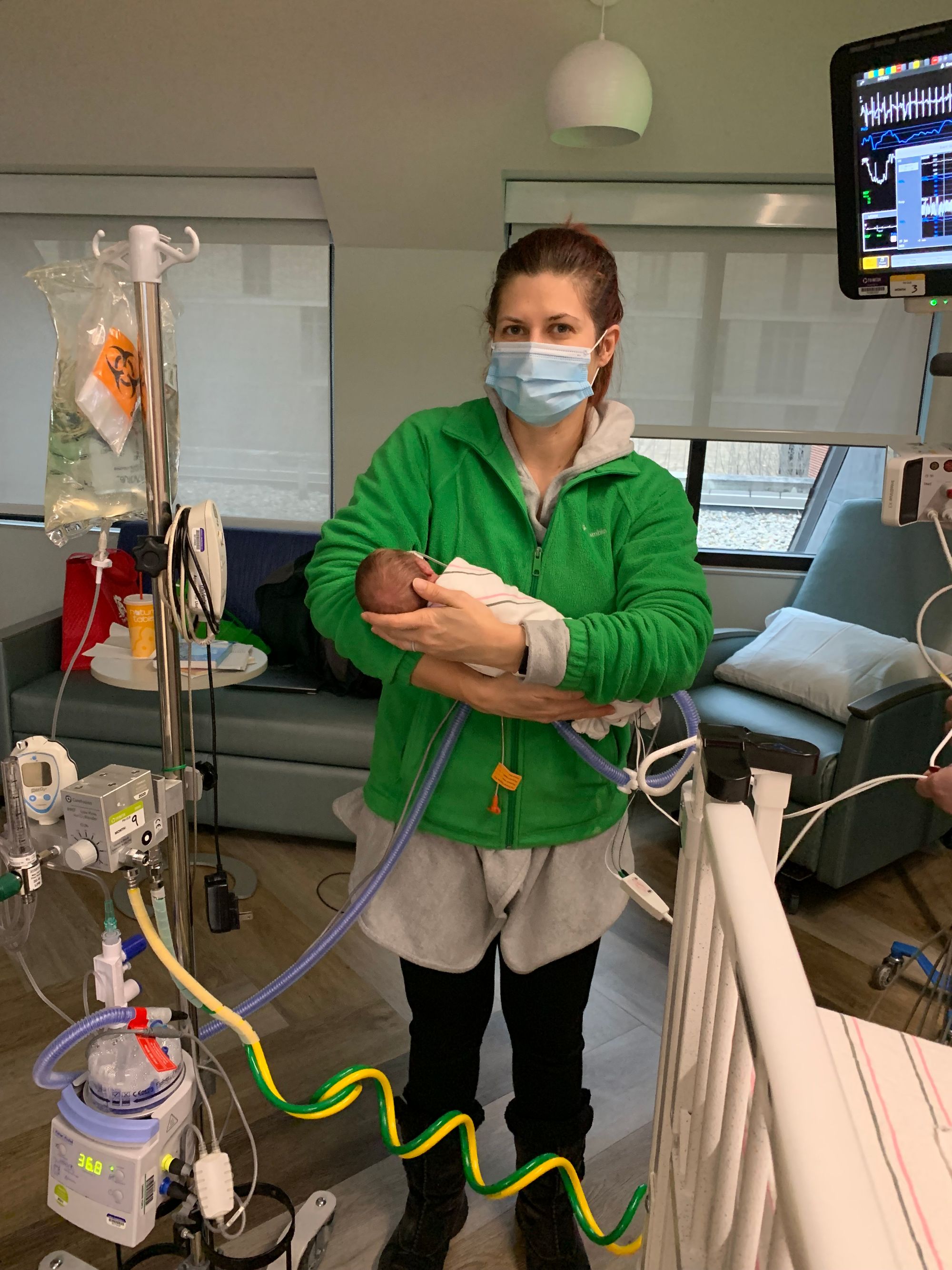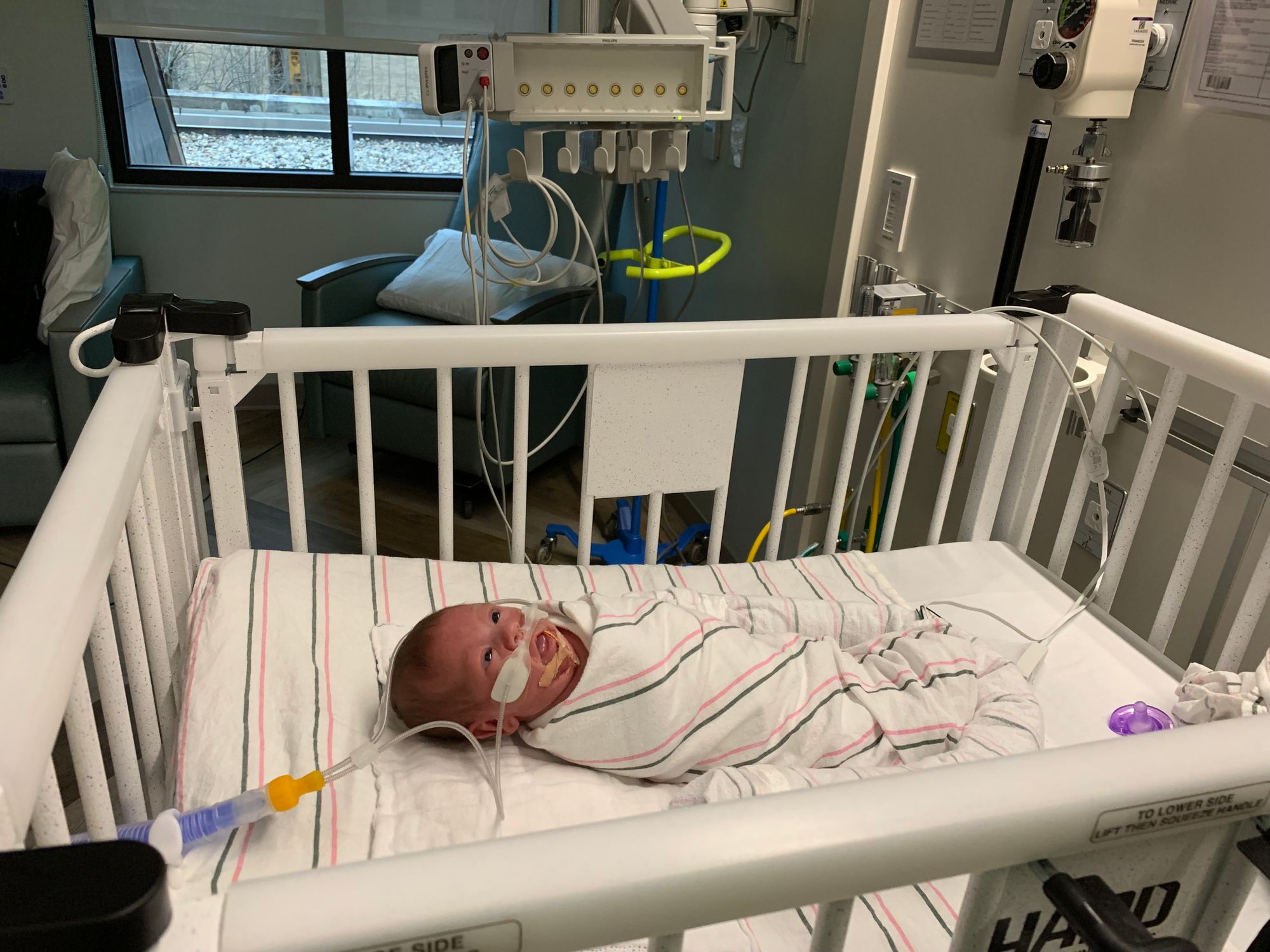 Jan 19 was the first day I held Leo while I was standing up. Before that I always sat in the chair and waited for the nurses to place him on my chest. It was usually a team of two nurses to make sure he and his collection of tubes and wires were handled correctly. Now that he's on the lower oxygen support with the nasal cannula and in a crib, we are allowed to pick him up any time we want without assistance.